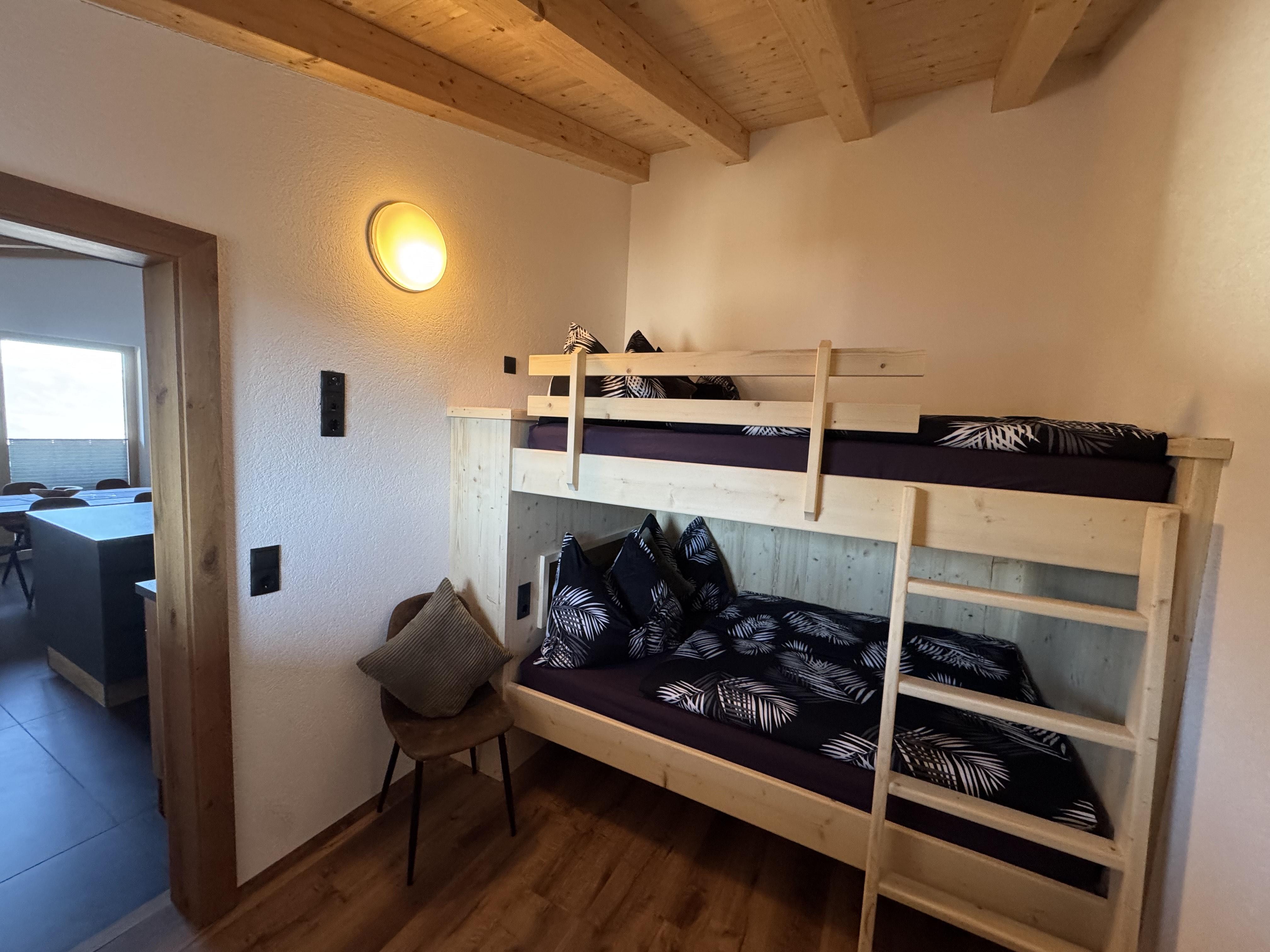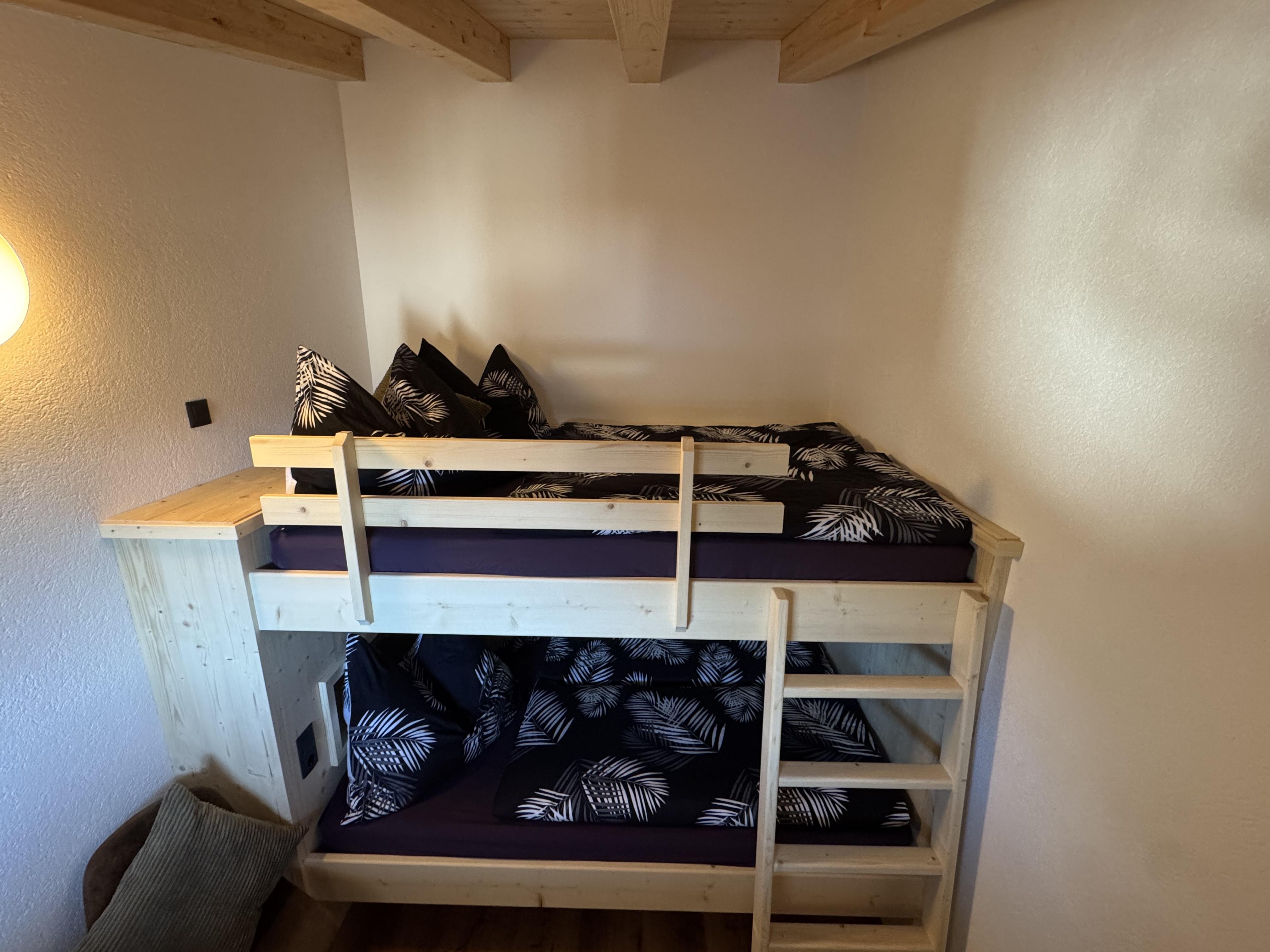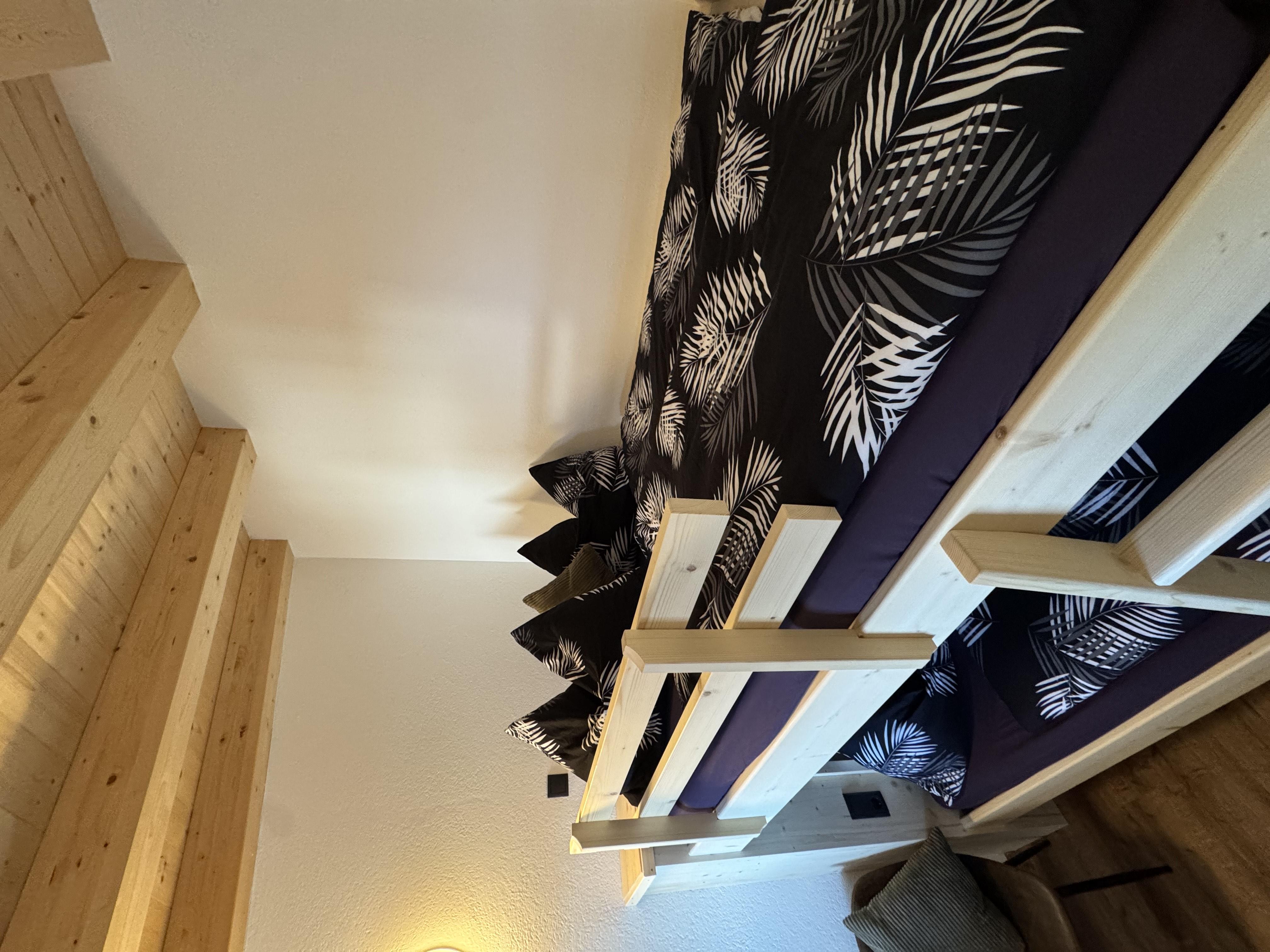 On the upper level, the attic, you will find the access, the ski room, and the entrance to the apartment. A practical wardrobe provides ample storage space. The generous kitchen is ideally equipped for preparing cozy meals. The beautiful living room with a balcony offers a splendid view and invites relaxation. A special highlight is the large bunk bed room (two beds of 140x200 cm), which is perfect for up to 4 people. In addition, there is a separate WC with a mirror and sink in the attic.