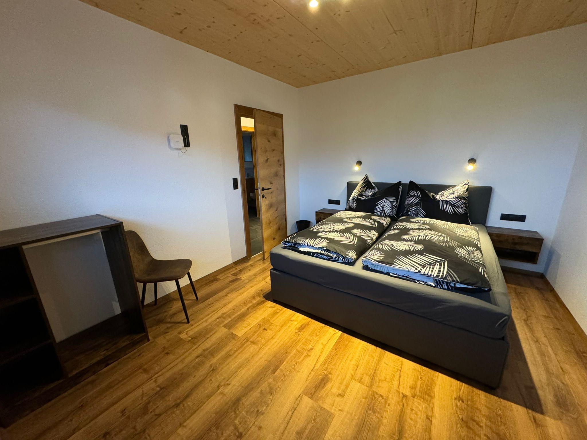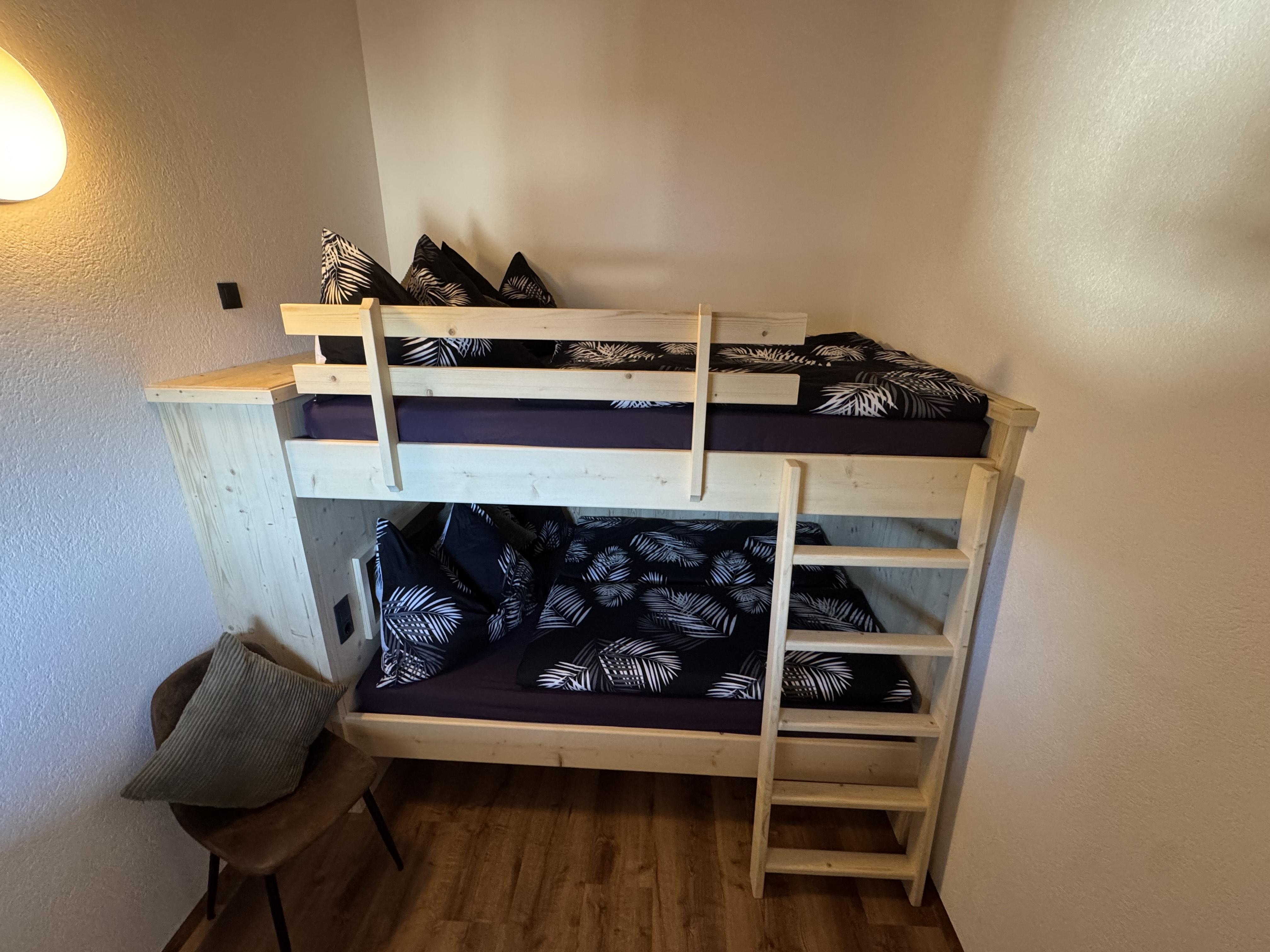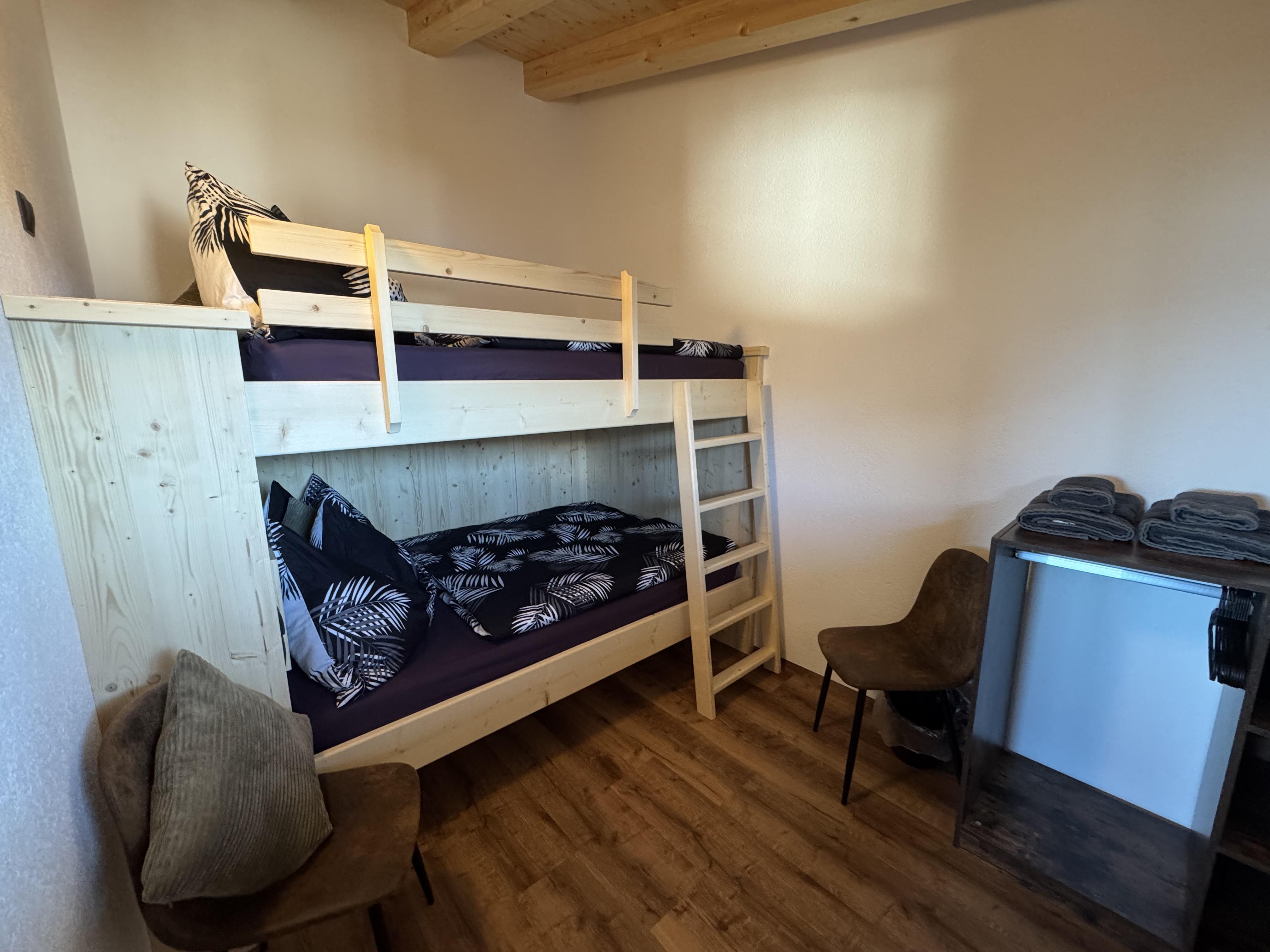 On the upper level, the attic, you will find the access, the ski room, and the entrance to the apartment. A practical wardrobe provides ample storage space. The generous kitchen is ideally equipped for preparing cozy meals. The beautiful living room with a balcony offers a splendid view and invites relaxation. A special highlight is the large bunk bed room (two beds of 140x200 cm), which is perfect for up to 4 people. In addition, there is a separate WC with a mirror and sink in the attic.