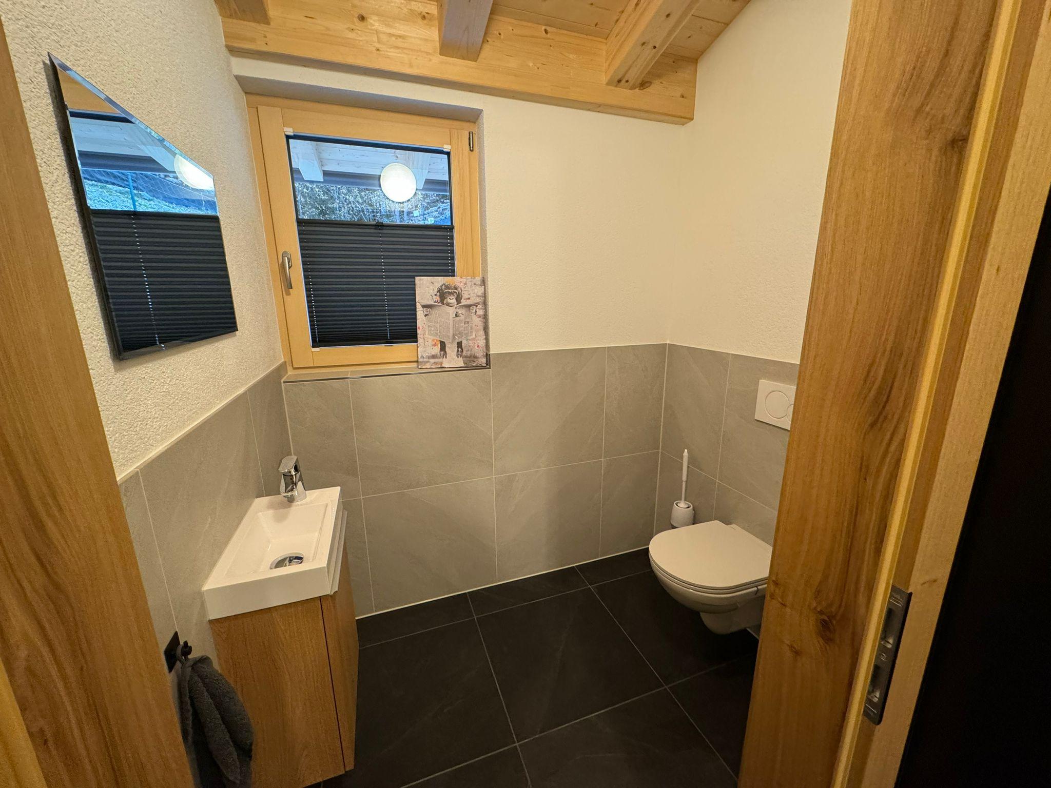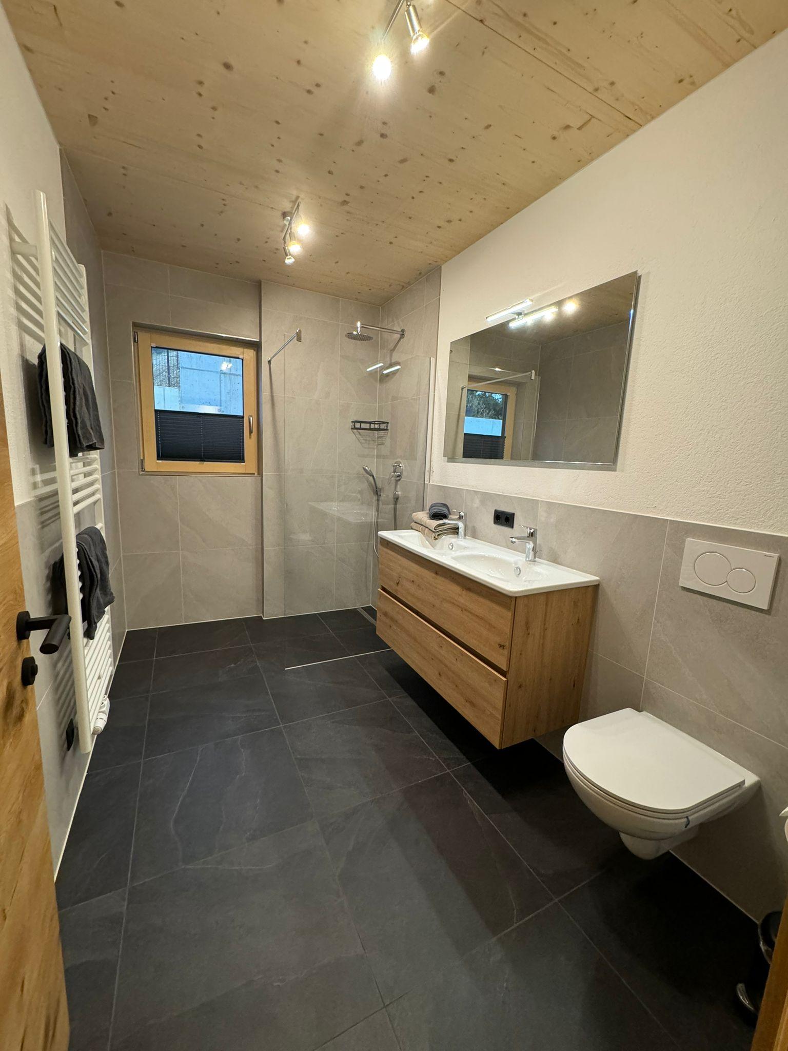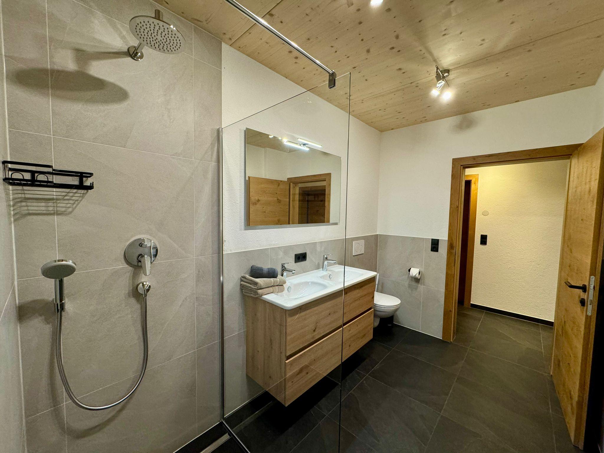 On the lower floor, there are three comfortable double bedrooms that provide access to a generous terrace—ideal for enjoying the sun and fresh mountain air. The bathroom on the lower floor is equipped with a WC, two sinks, and a modern shower, providing plenty of space for relaxation after an active day.