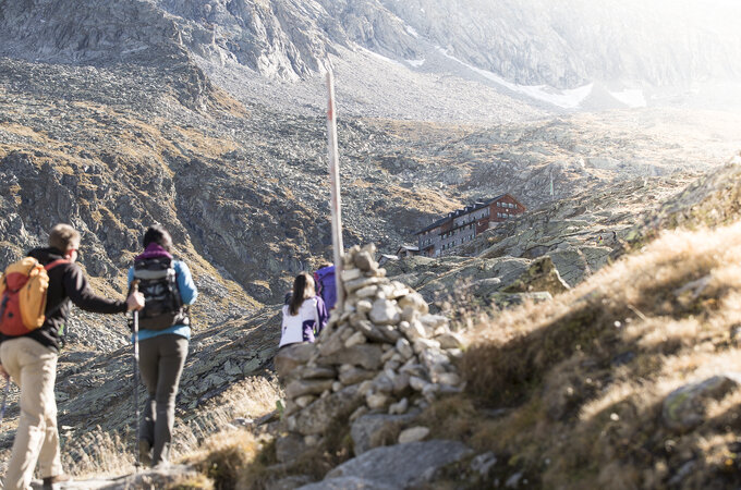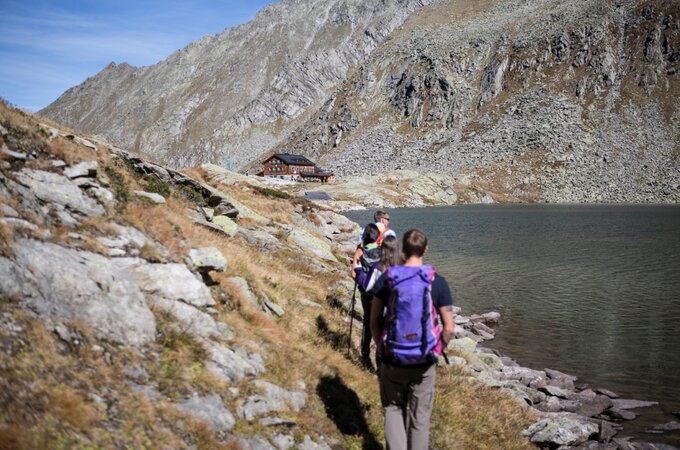 We begin our tour on the southern outskirts of the village of Krimml. The route first leads us along the panoramic track that follows the Krimml Waterfalls all the way up to the topmost waterfall. This is where the Krimml Achental valley begins, one of the most beautiful high valleys in the Hohe Tauern National Park. At the heart of the valley is the Krimml Tauernhaus where we enjoy a well-earned break before continuing in a northerly direction past the chapel, up to the Rainbachtal valley and, a few bends further, to Schlagegg. Just after Schlagegg we turn right down the steep track and then uphill again in zigzags to the Rainbachsee lake (2,404 m) and left along the lakeside via the rope-secured track to the Rainbachscharte col (2,724 m). From here a track descends, past the Obere Wildgerlossee lake, down in serpentines to the Untere Wildgerlossee lake and along its banks to the Zittauer Hütte mountain hut. The hut enjoys a unique, idyllic lakeside location at the foot of the Reichenspitz mountain. Here, at an altitude of 2,329 m, is where we spend our first night.