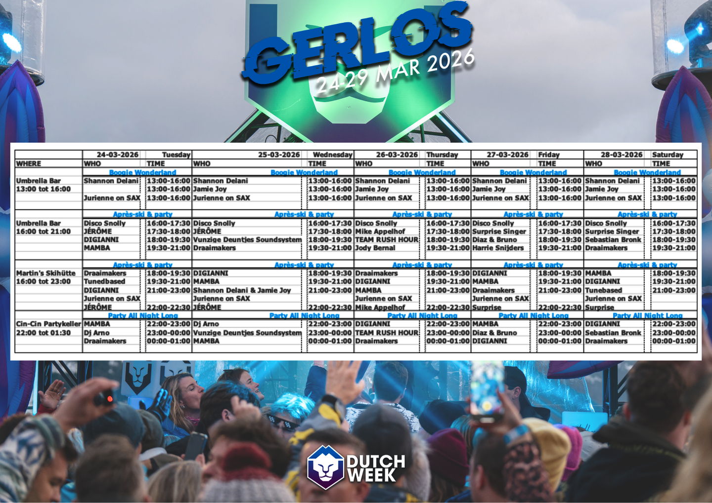 Van 24 t/m 29 maart 2026 barst het weer los met een week vol muziek, energie en optredens van top-DJ’s en artiesten. Sneeuw, feest en onvergetelijke vibes gegarandeerd!