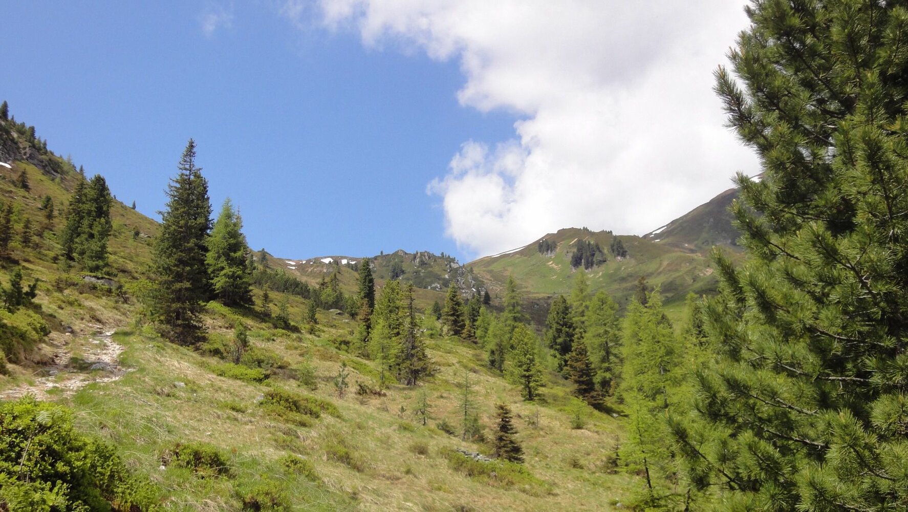 Continue along the brook, we reach the "Krummbachrast" - a hut with its own cheese factory and a big  terrace. After a short refreshment we walk past  to the bridge, where the trail climbs through a short forest section to the Nöckeltalalm. From the Arena Center (top station Isskogelbahn) and Latschenalm we follow a slightly ascending path of goods.