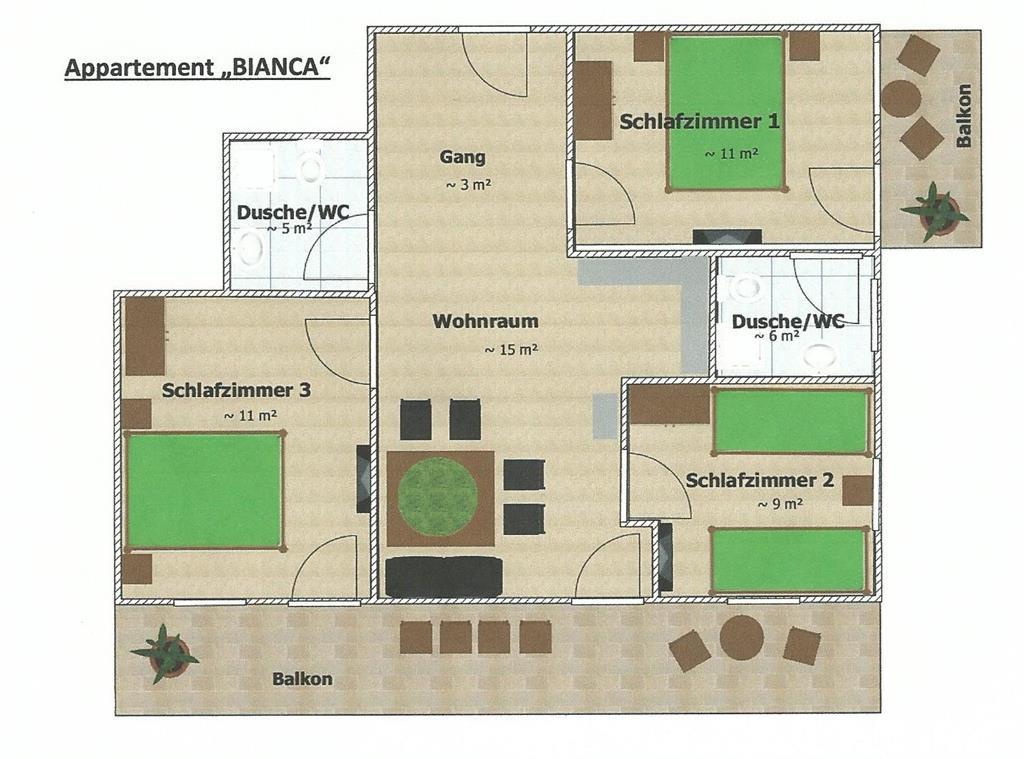 In het huis Arenablick zijn het appartement "Stephan" (op de begane grond) en het appartement "Bianca" (op de bovenverdieping) beschikbaar voor maximaal 6 personen elk.