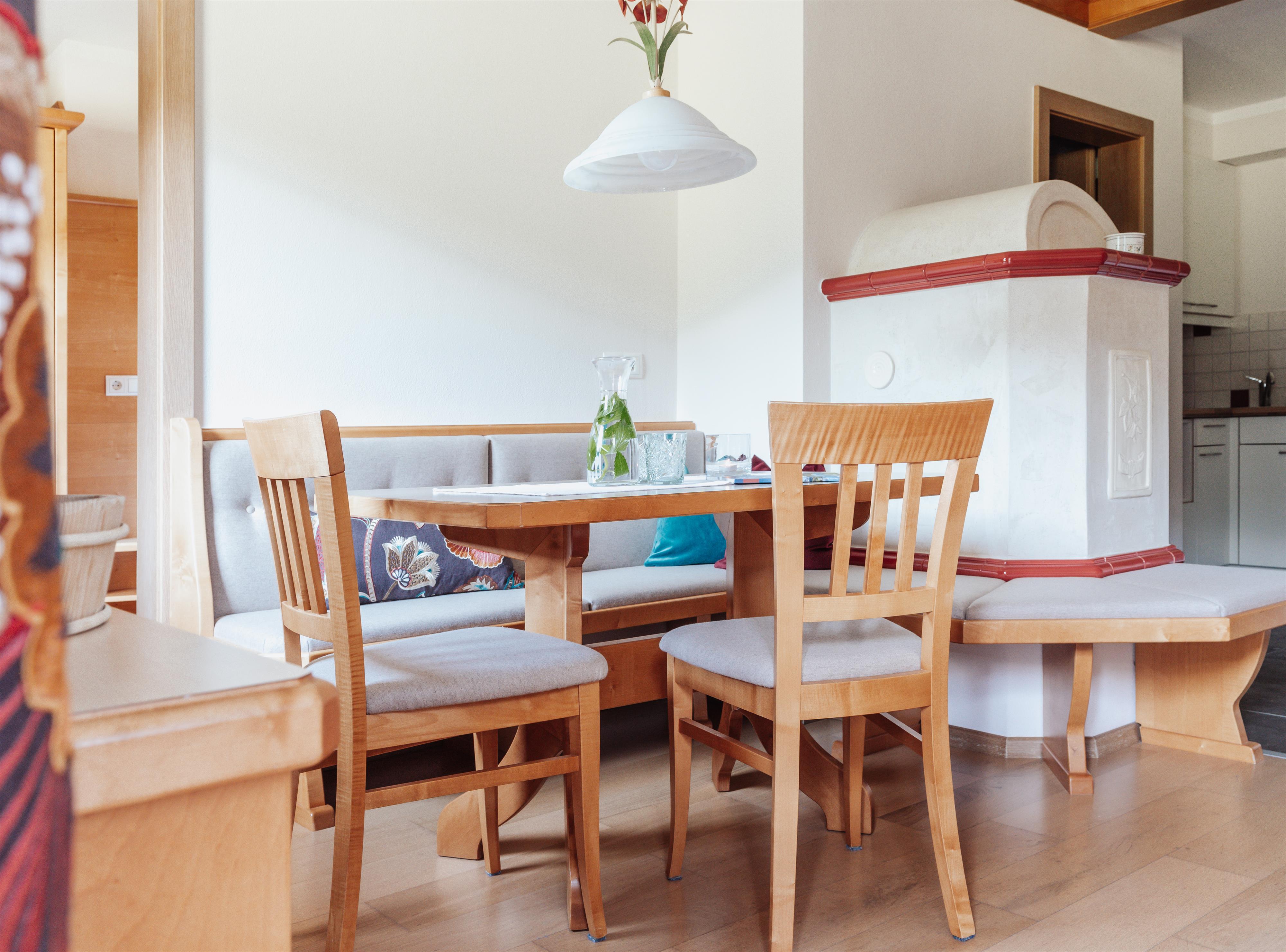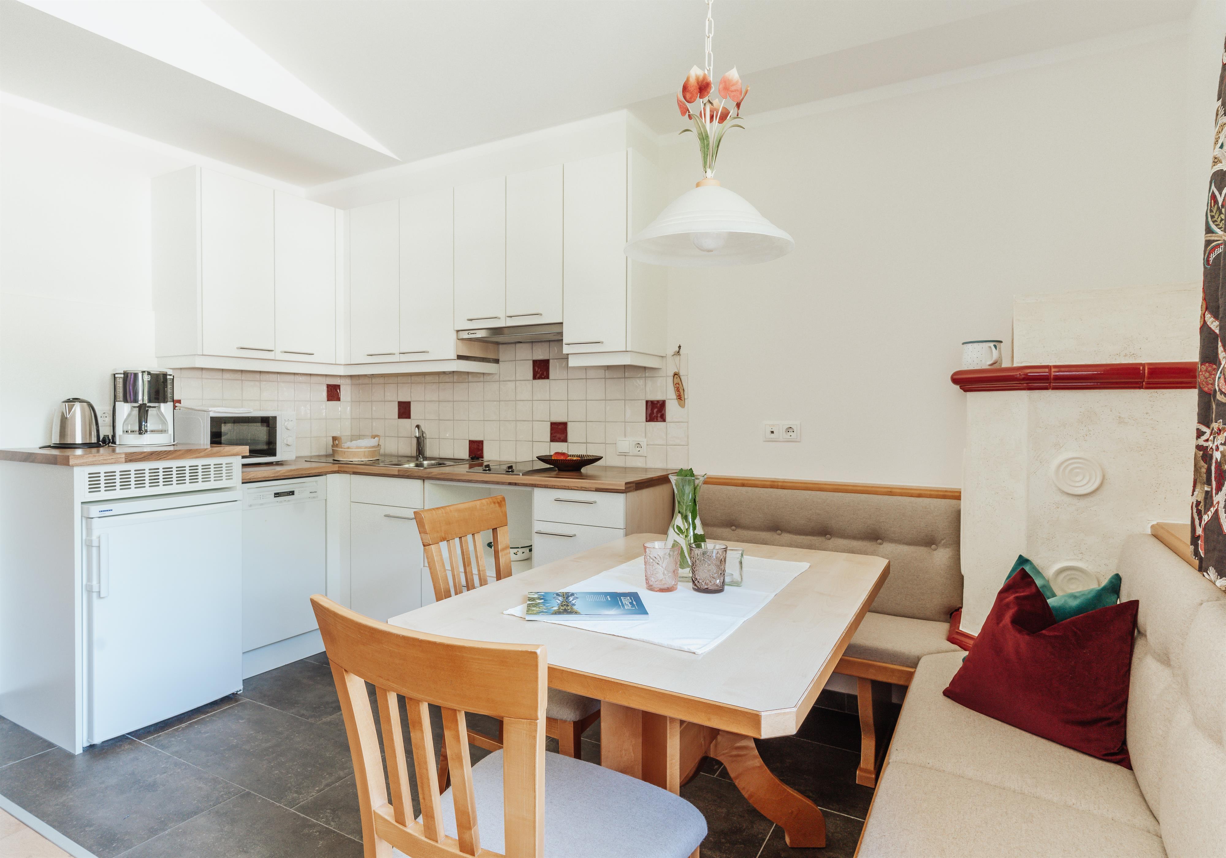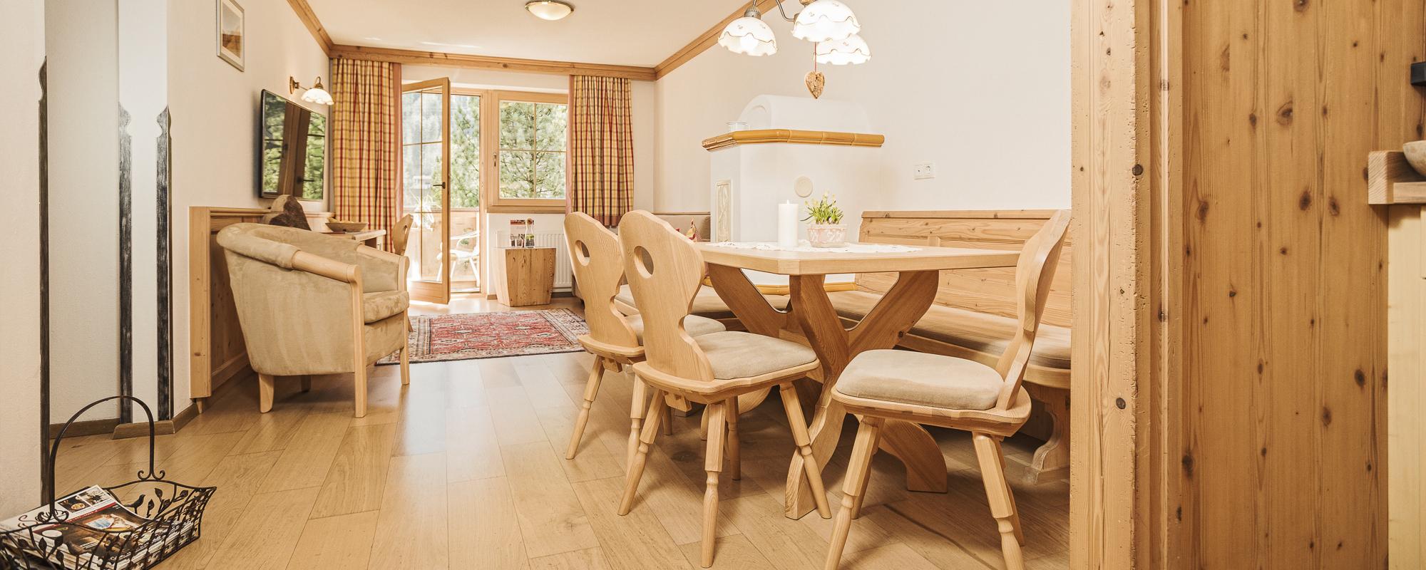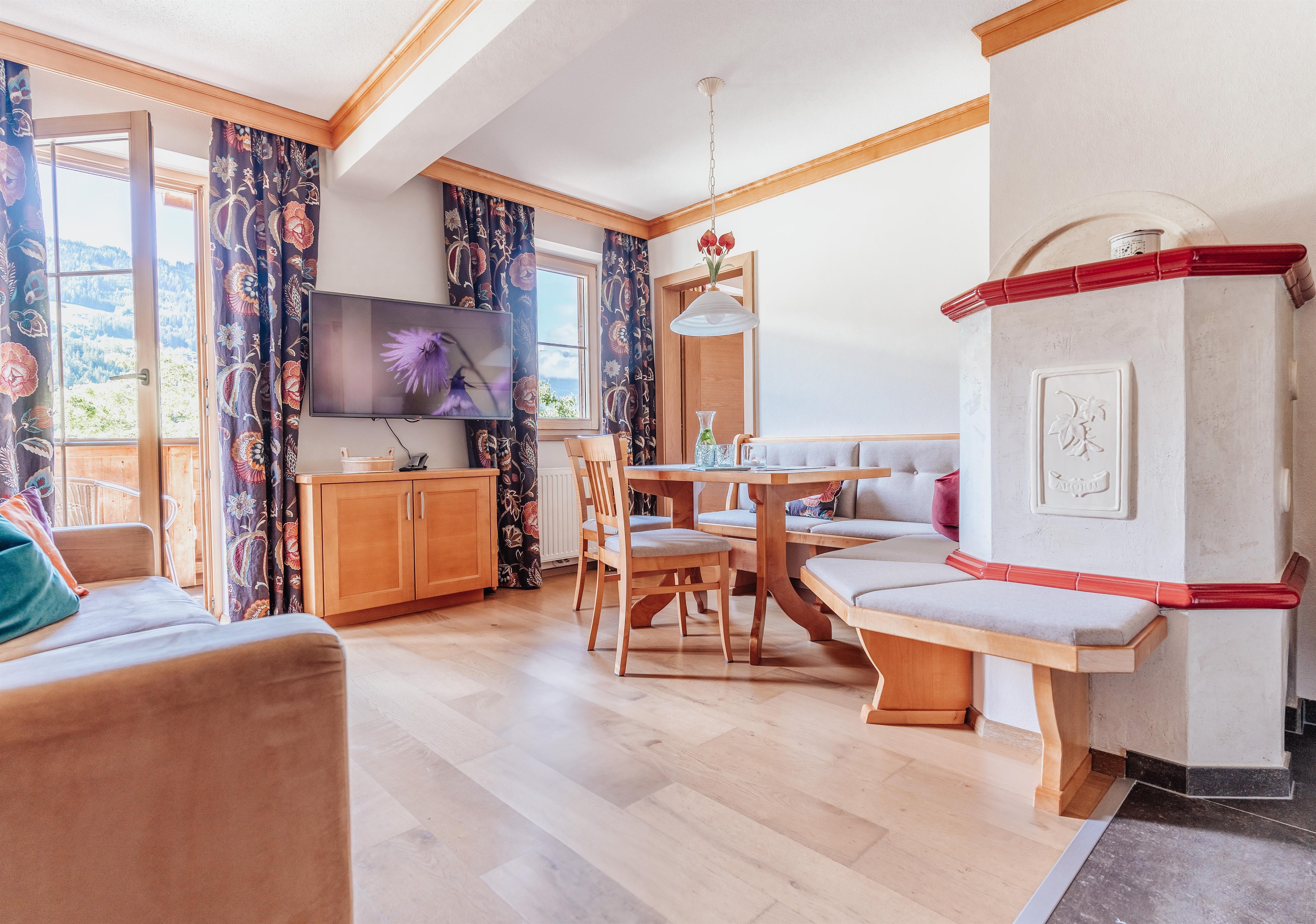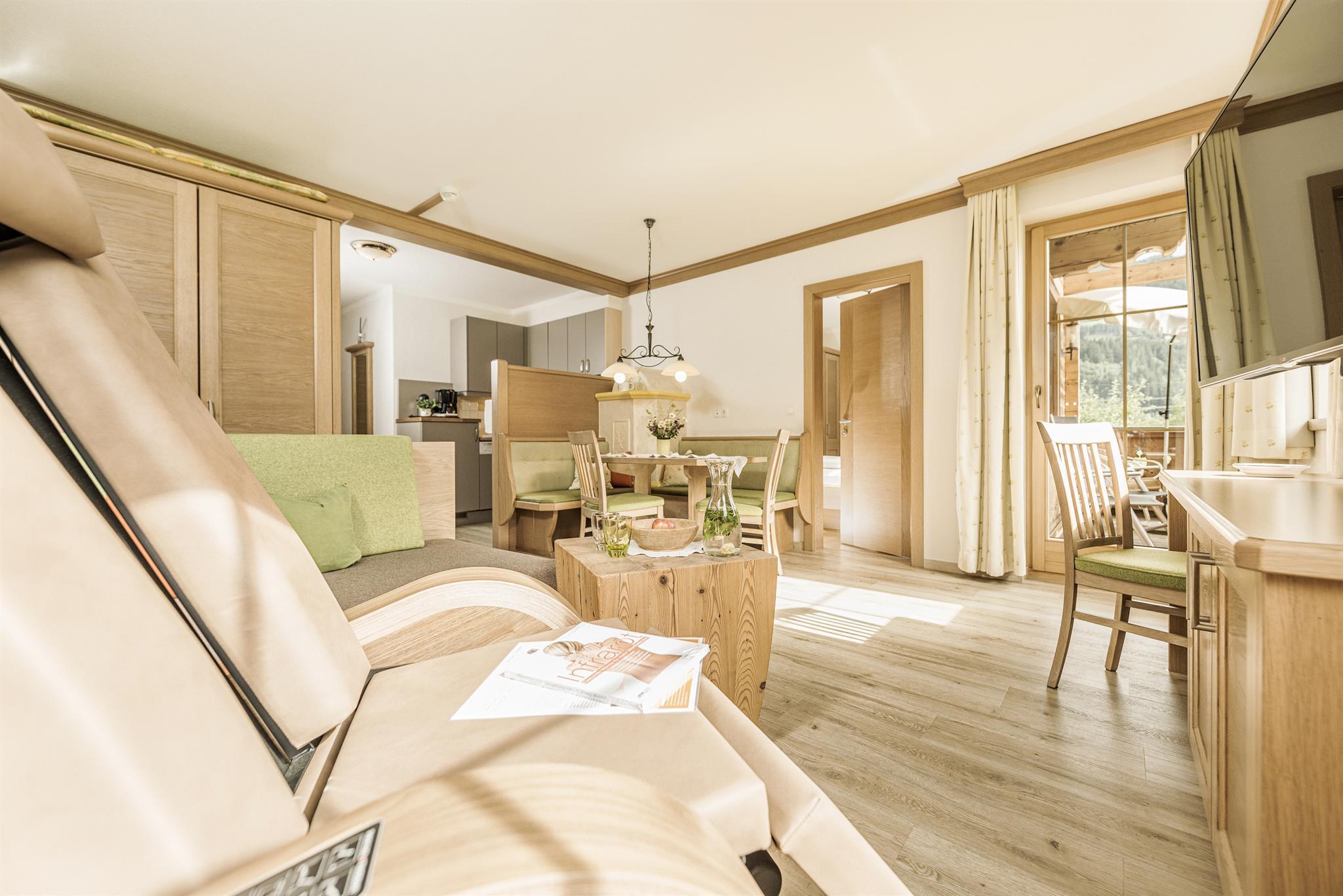 De stijlvolle inrichting van activerende houtsoorten zet unieke accenten, verspreidt een aangename houtgeur en een weldadig gevoel vol vertrouwdheid en geborgenheid. Elk van de welzijn appartementen beschikt over houten vloeren, allergievriendelijke beddengoed, 2 x LED TV (1x47 inch), kluis, telefoon, gratis Wi-Fi, gezellige woonkamer met zithoek bij de "huiselijke" tegelhaard, comfortabele leesstoel, comfortabele bank in de woonkamer, volledig uitgeruste keuken met 2 kookzones inductiekookplaat, vaatwasser, waterkoker, afzuigkap, koelkast, magnetron, koffiezetapparaat, badkamers met deels ligbad met douchefunctie of douche, deels dubbele wastafel, handdoeken, badhanddoeken, douchegel, theedoeken, poetsdoeken, schoonmaakmiddelen, haardroger, toiletpapier.