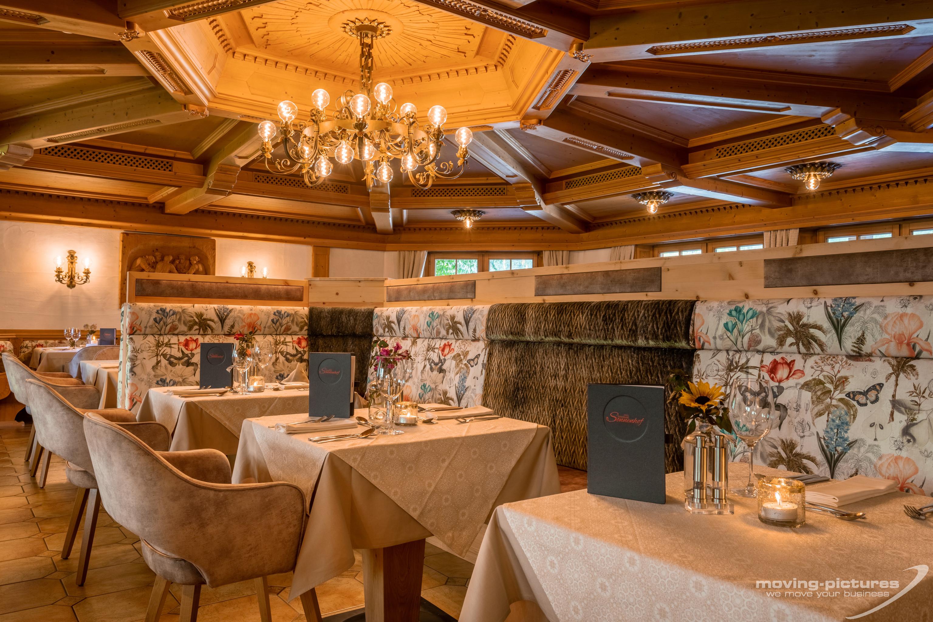 Culinaire geneugten in de Sonnenhof worden gepresenteerd in het kader van de verzorgde halfpension: de fijnste gerechten in uitzonderlijke kwaliteit, bereid met geselecteerde ingrediënten. Daarbij wordt bijzondere aandacht besteed aan verse producten uit eigen teelt. Uitstekend vlees van duurzame berglandbouw van de eigen boerderij, aromatische keukenkruiden zoals munt, lavendel en salie uit de kruiden tuin van de Sonnenhof, daarnaast handgeplukte wijnen uit de eigen wijngaard in Burgenland – dat is de keuken van de Sonnenhof. Eerlijk, intens en vol karakter.