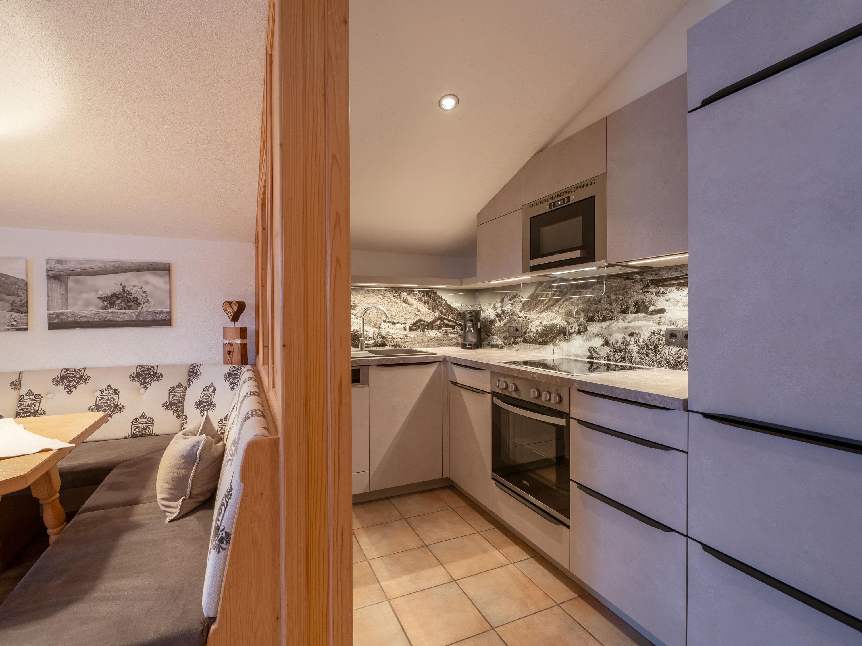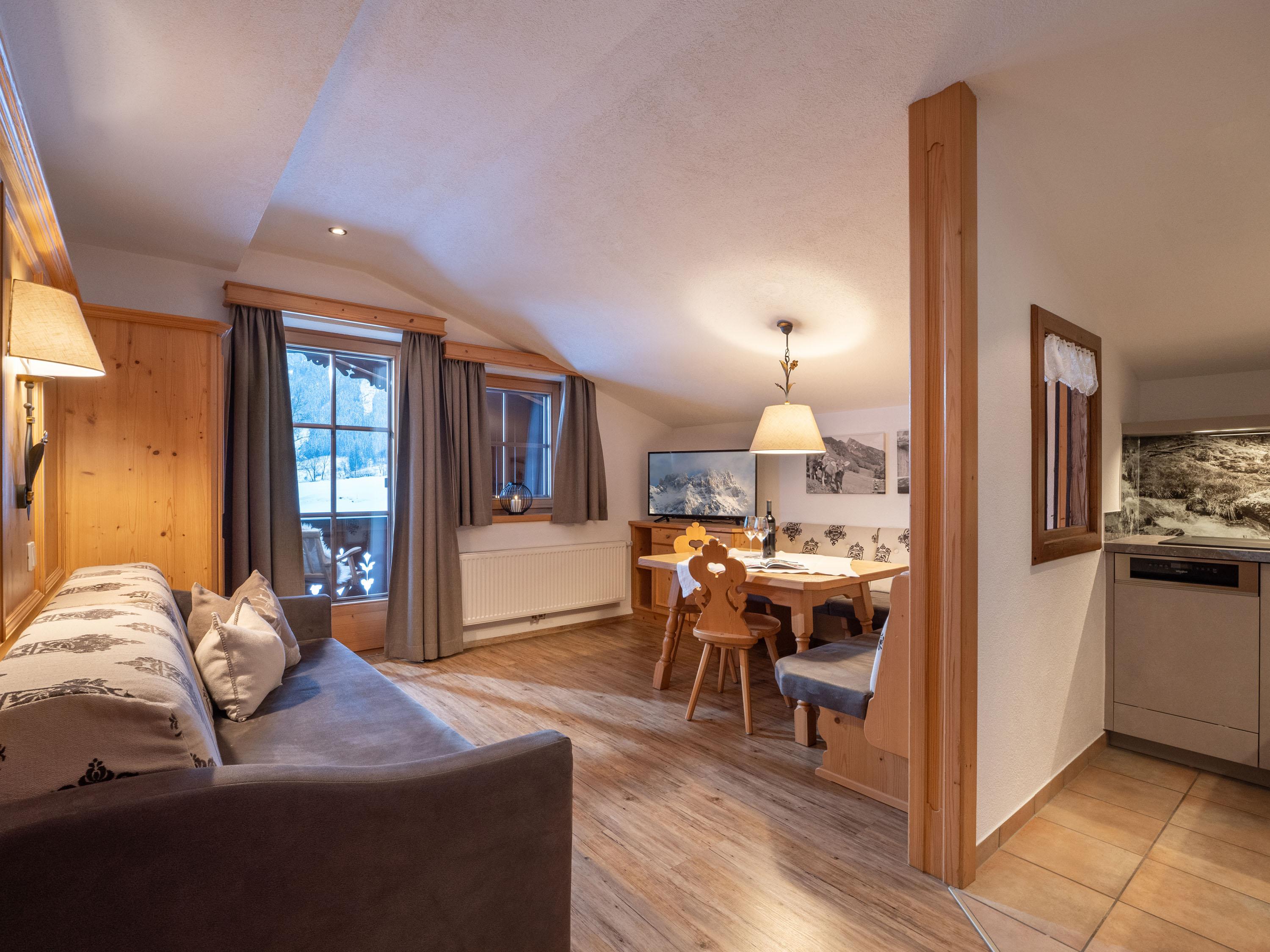 „Wonen met comfort: Onze appartementen zijn volledig uitgerust inclusief keukengerei en linnengoed. Wie zich 's ochtends graag laat verwennen, boekt eenvoudig ons ontbijtpakket voor 15,– € (kinderen 9,– €) erbij – we dekken de tafel voor u! Voor self-catering is bovendien onze dagelijkse broodjesservice beschikbaar.“