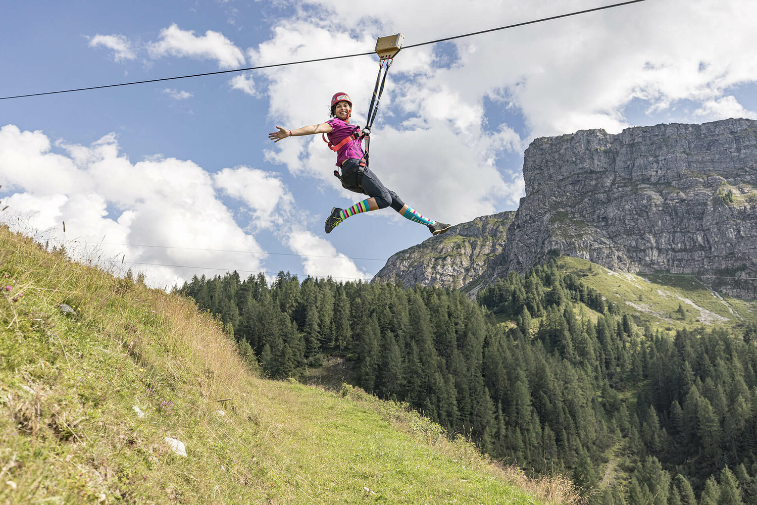 Die Ausrüstung (Helm & Gurtzeug) für die Benützung des Almfliegers ist vor Ort vorhanden!