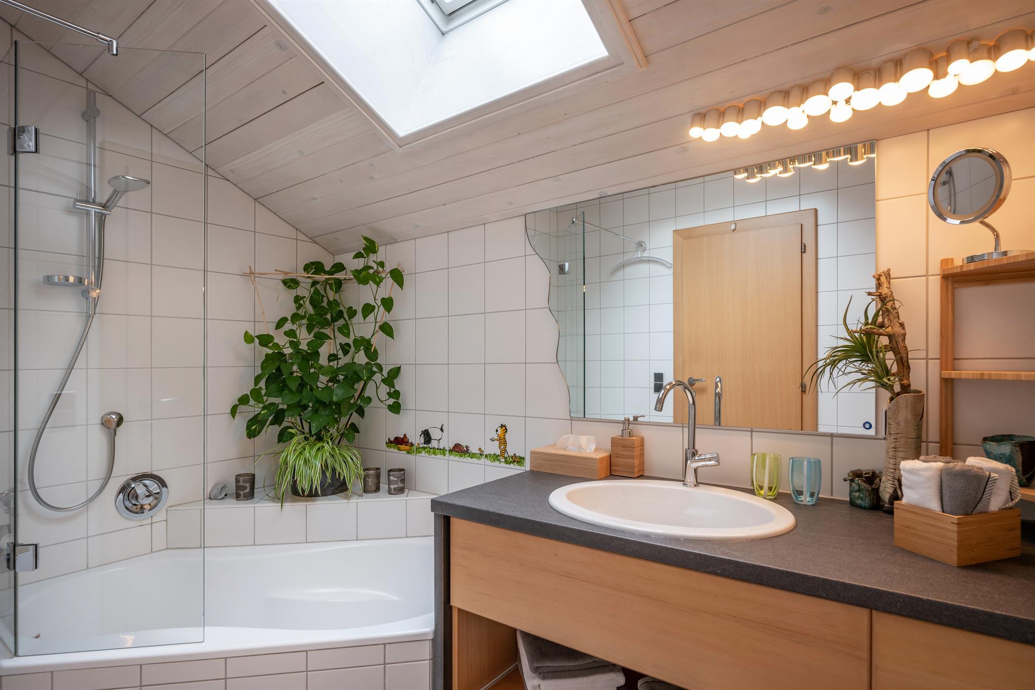 d) einem Bad mit WC und Dusche und einer Waschmaschine.