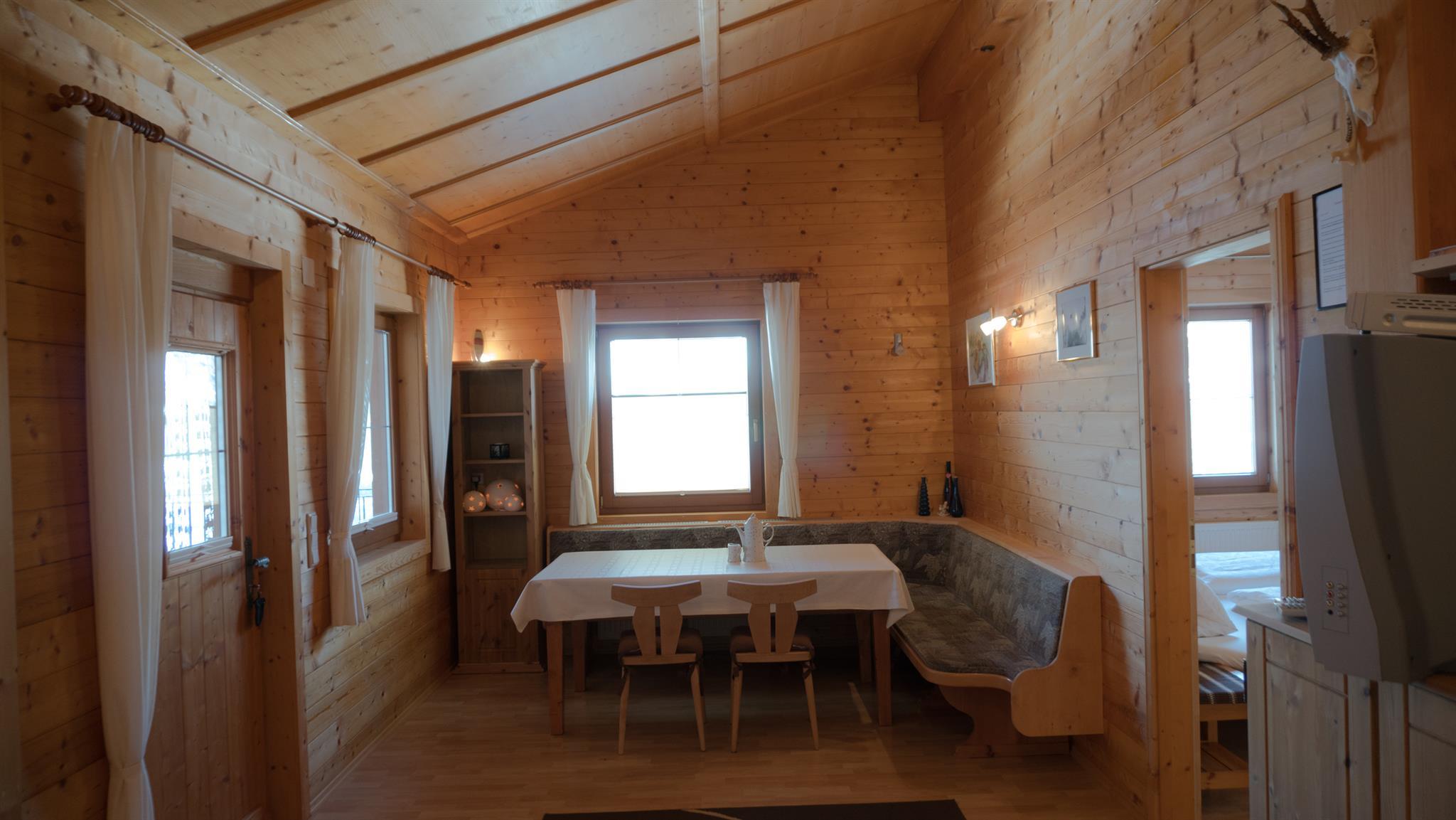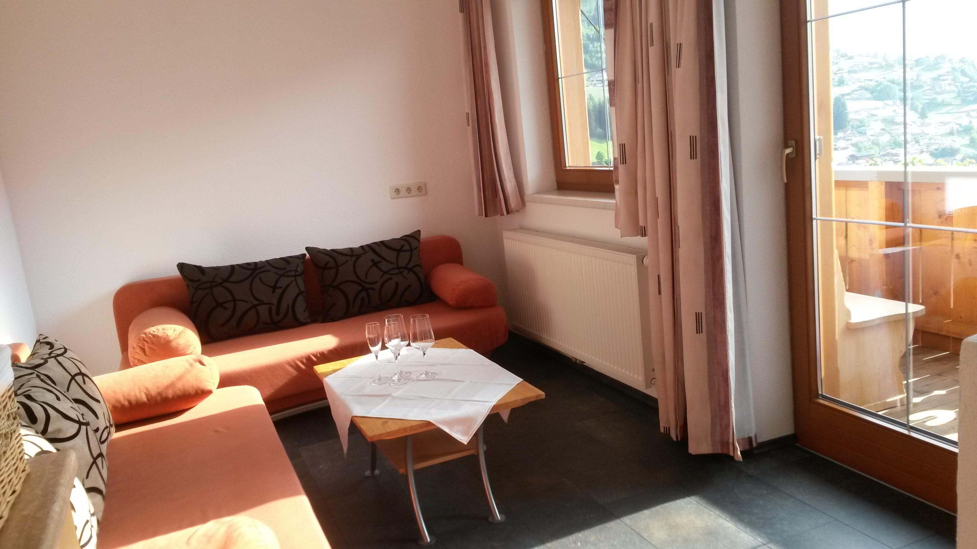Ferienwohnung "Marchkopf", mit Terrasse, gesamt 85 m2 hat ein großes Wohnzimmer mit Kachelofen, Küche, 2 Schlafzimmer, Dusche/WC/WB, und ein WC extra, gemütlich eingerichtet, typisch Zillertal mit viel Holz.