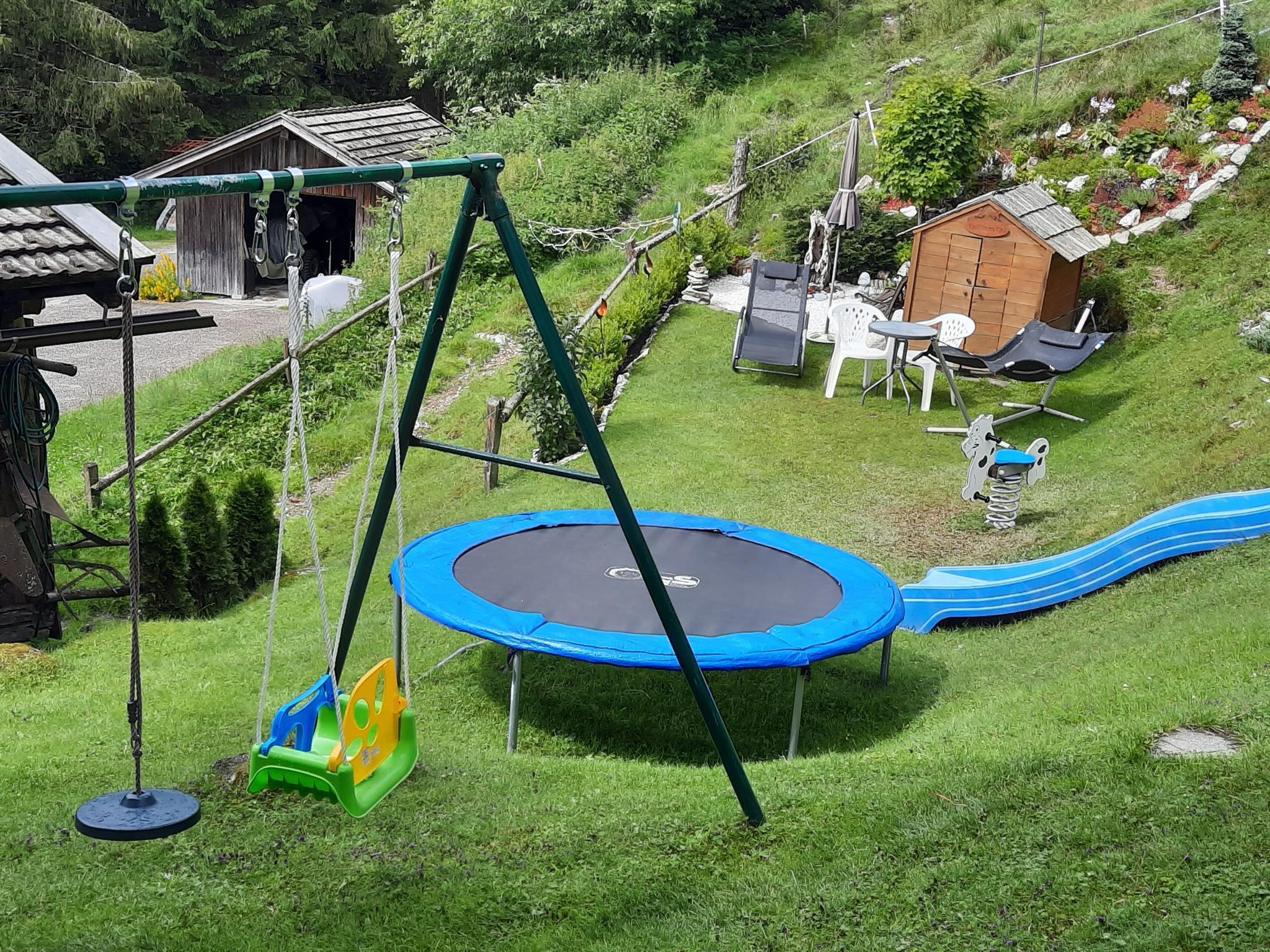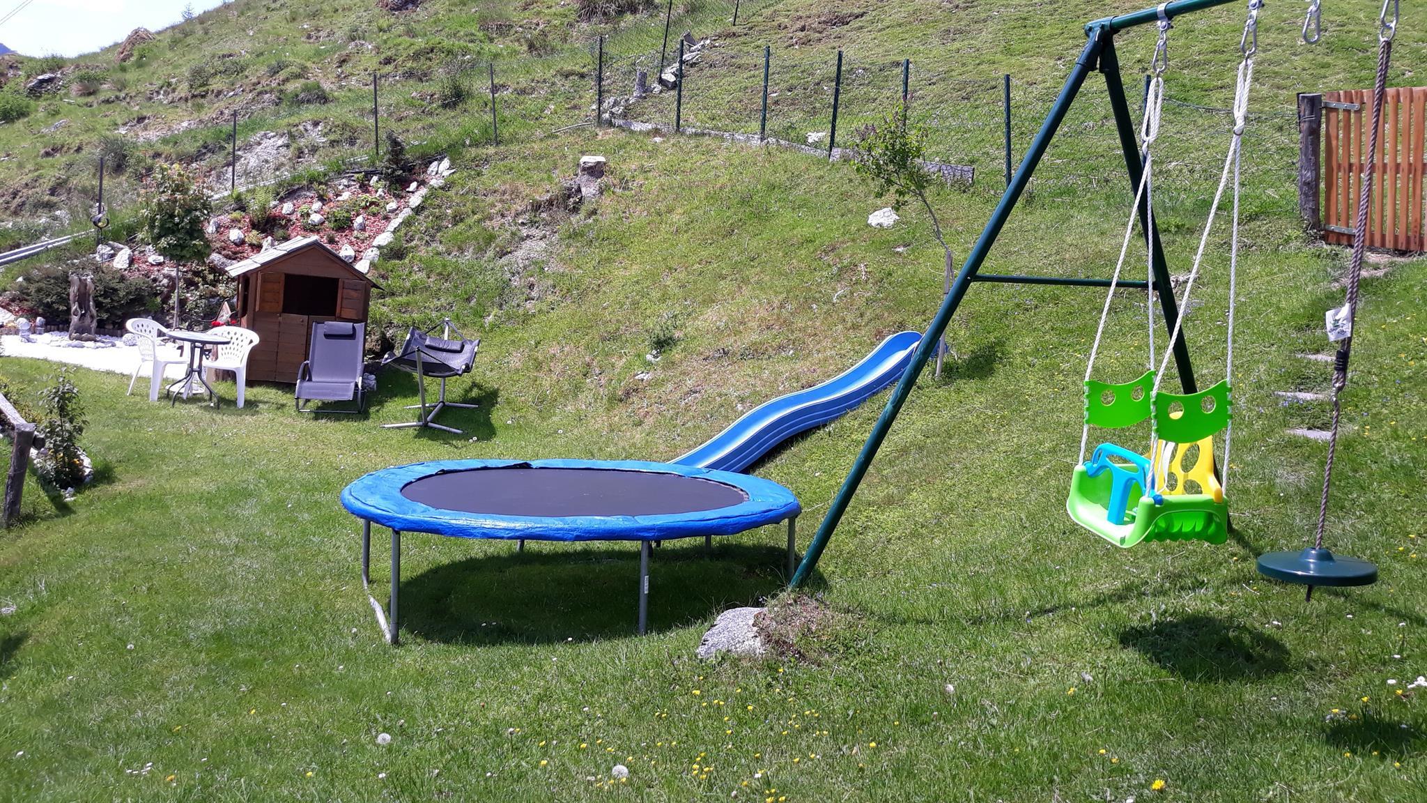 Sommer: Kinderspielplatz mit Trampolin, Schaukel, Rutsche, Sandkiste, Streichelzoo, Terrasse, sowie Möglichkeit zum Grillen vorhanden.