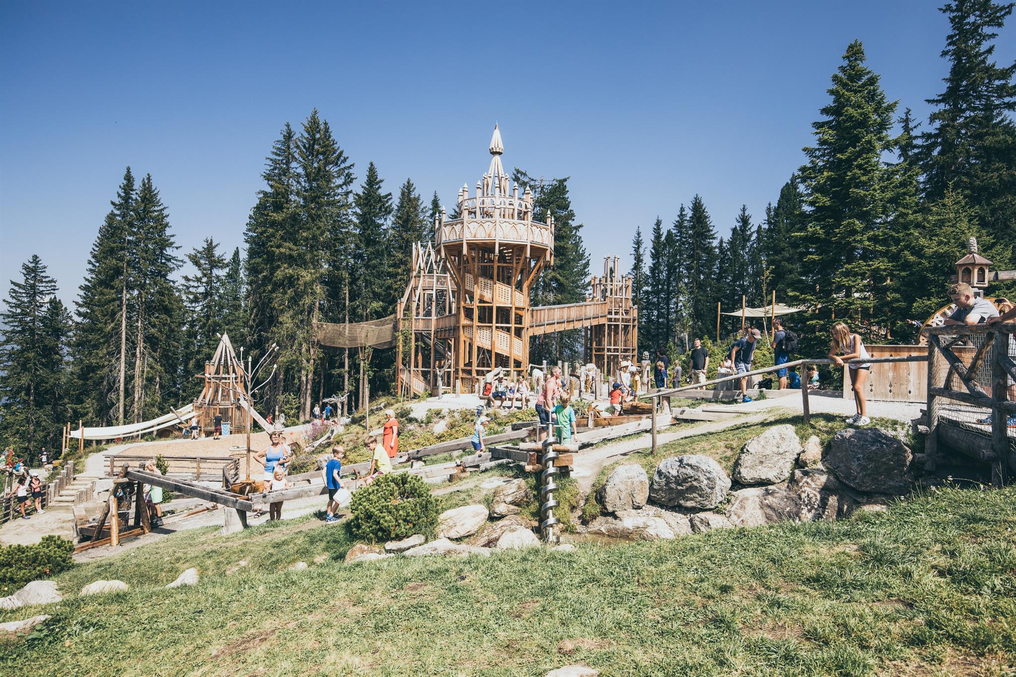 Das Fichtenschloss auf der Rosenalm in Zell am Ziller ist ein Paradies für die ganze Familie. Klettern, Rutschen, die Fichtenwichtel-Holzkugelbahn und den Hängemattenwald, den Wasserspiel- und Sandspielbereich erkunden oder die herrliche Aussicht genießen.